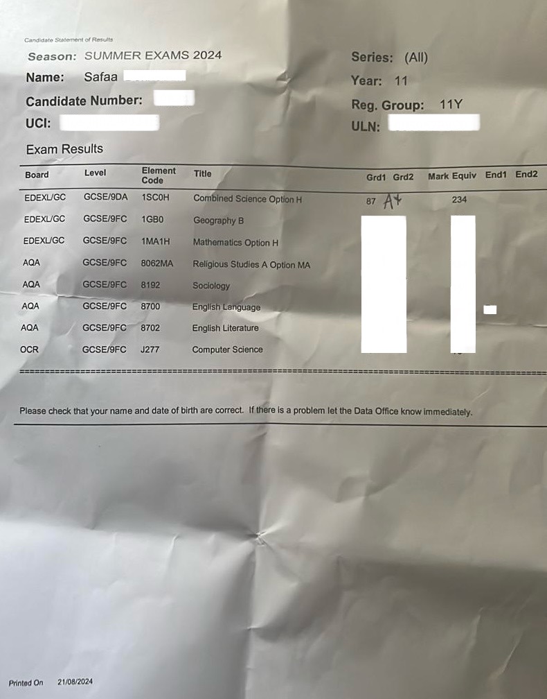 In January 2024, Safaa was predicted a Grade 5 in Combined Science. With support, her prediction rose to a 7 by March. She joined KWZM in April 2024 for final preparation before her GCSEs in May and June.